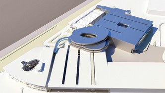 "heart" of Nice. In this hypothesis, the area which we nick-named the "flying saucer" from the start, was imagined in the centre, suspended between the headquarter and the production area, and conceived as three, stacked, large ellipse-shaped 'rings' and with each 'ring' rotated in a