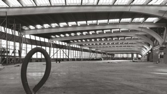 Inside, the flow is interrupted by metal spans recurring every 15 metres and zenithal light – a continuous row of skylights in line with the spans dematerializing them and giving the structure its lightness. The façade with its alternating opal and clear glass windows enables the workers to enjoy the view of the mountains on the horizon.